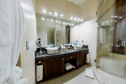 El cuarto de baño combina acabados clásicos realizados con técnicas ancestrales: se puede apreciar el taldelakt de sus muros, recubrimiento de cal obtenida de Marrakech, matizado con pigmentos naturales y aplicado bajo un minucioso proceso, dando como resultado esta decoración que solo en los baños y fachadas más lujosas se puede encontrar.